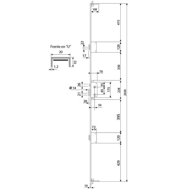 Frente de acero de perfil en U de elevada rigidez, idóneo para puertas resistentes al fuego.