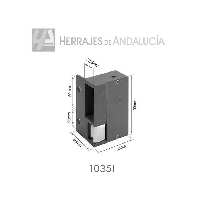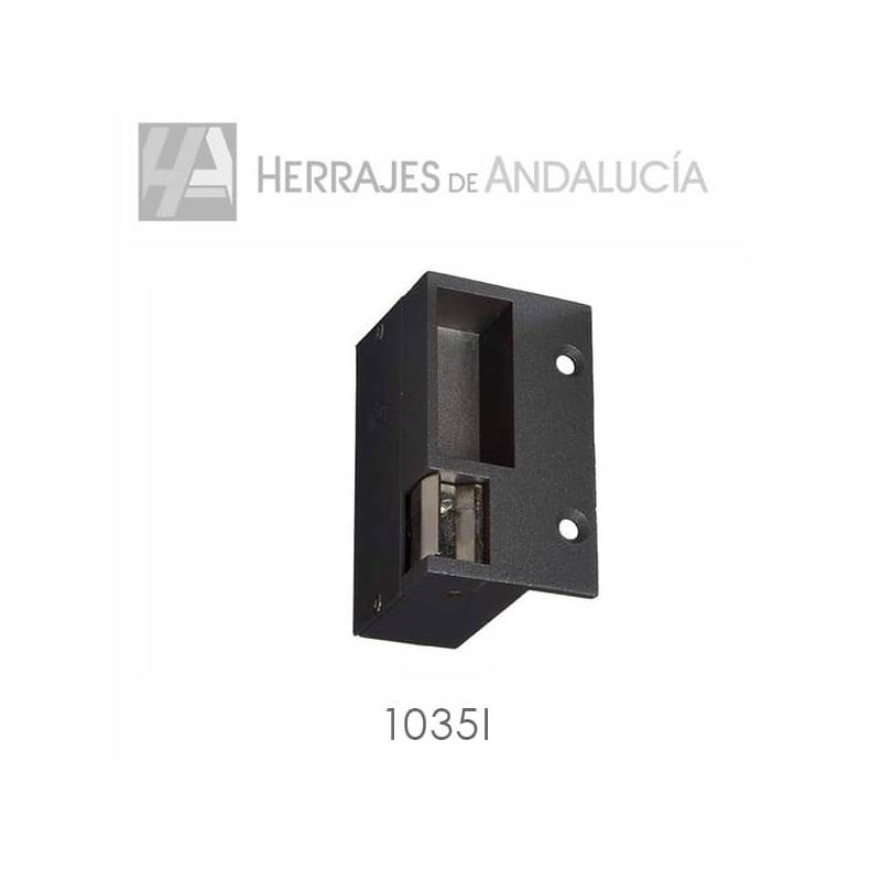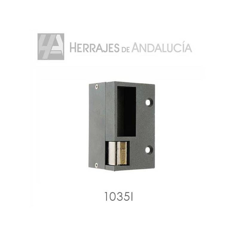 - Este pestillo eléctrico modelo 1035I para puerta con un sentido de apertura hacia la izquierda, es de tipo con receptor de pestillo y tiene liberación automática, por lo que al recibir el impulso eléctrico de 12 V. (corriente alterna) queda desbloqueado directamente para su apertura.