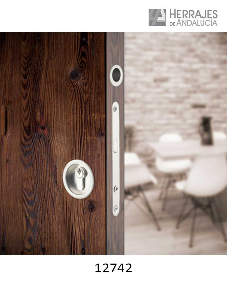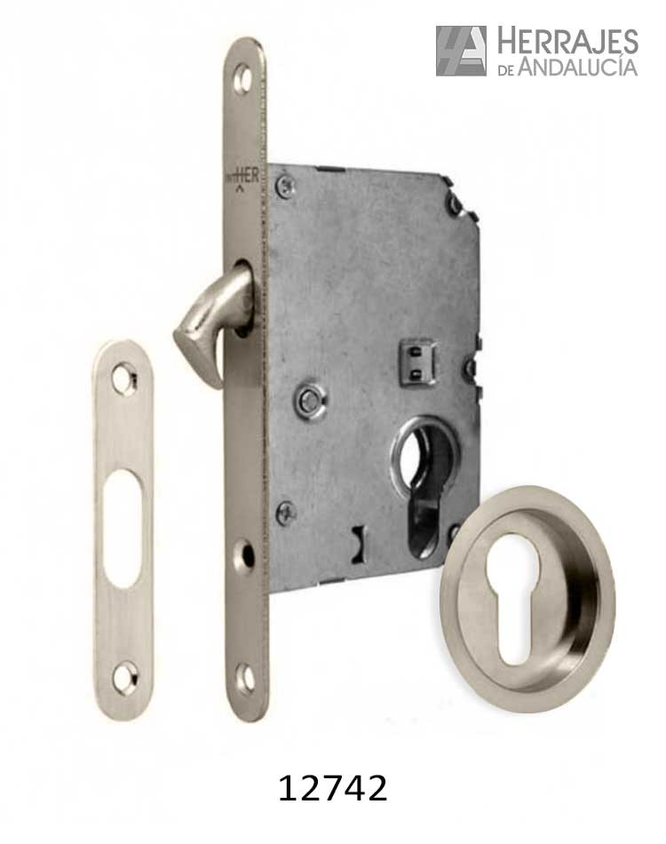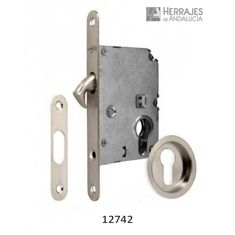 Kit para puertas correderas compuesto por cerradura, bocallave yale, dedal y cerradero. Diseño minimalista acabado en níquel satinado. Bocallave en placa redonda adaptable según grosor de la puerta.