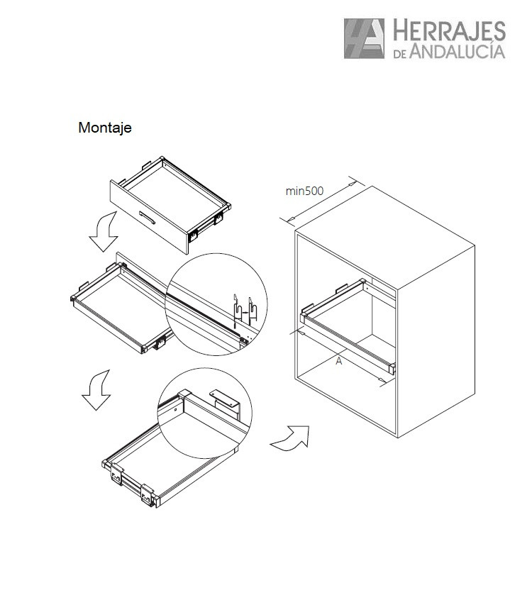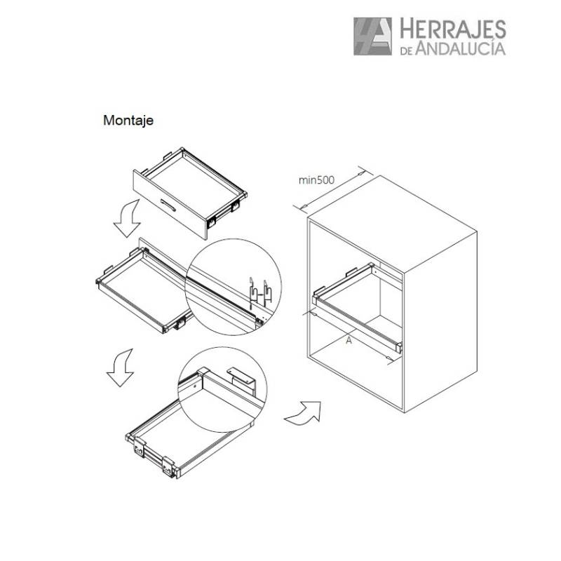 - Estas guías permanecen ocultas y permiten extracción total y cierre suave, con un sistema de clipado automático y rápido para la instalación del bastidor.