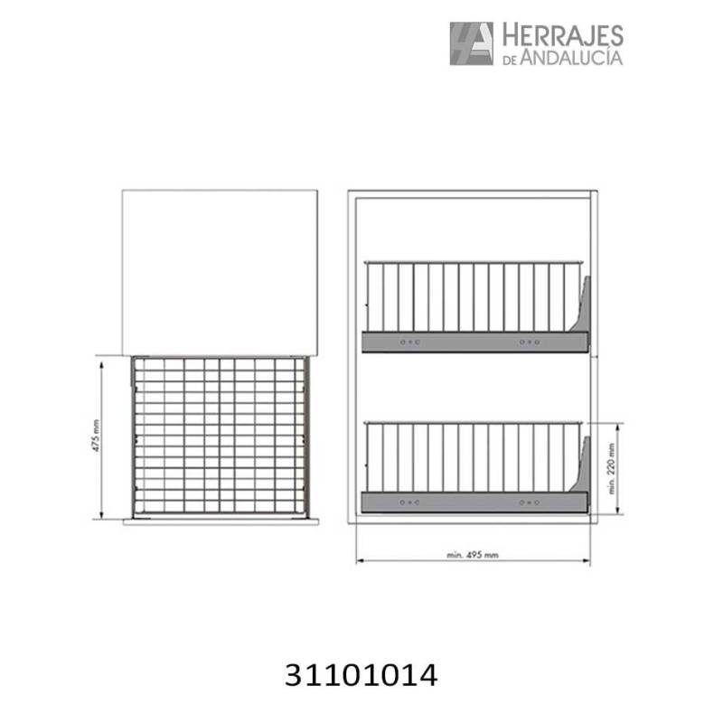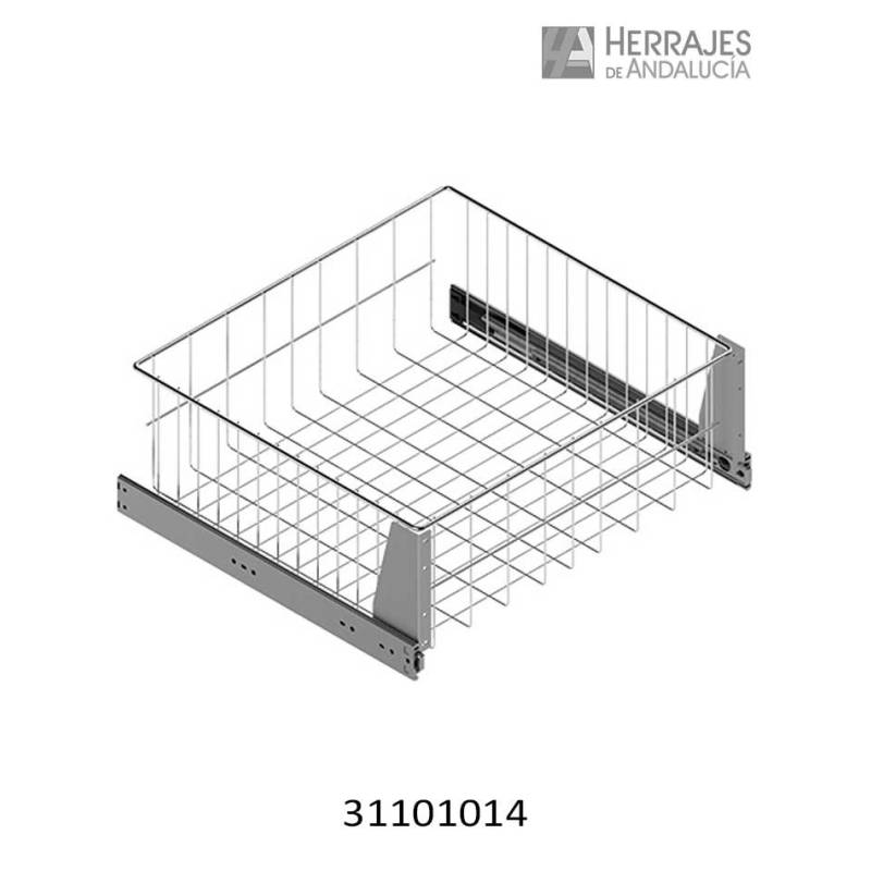 Cesto cacelorero que cuenta con guías correderas con extracción total y absorción automática, escuadras de fijación al frente y una carga máxima de 45 kg.