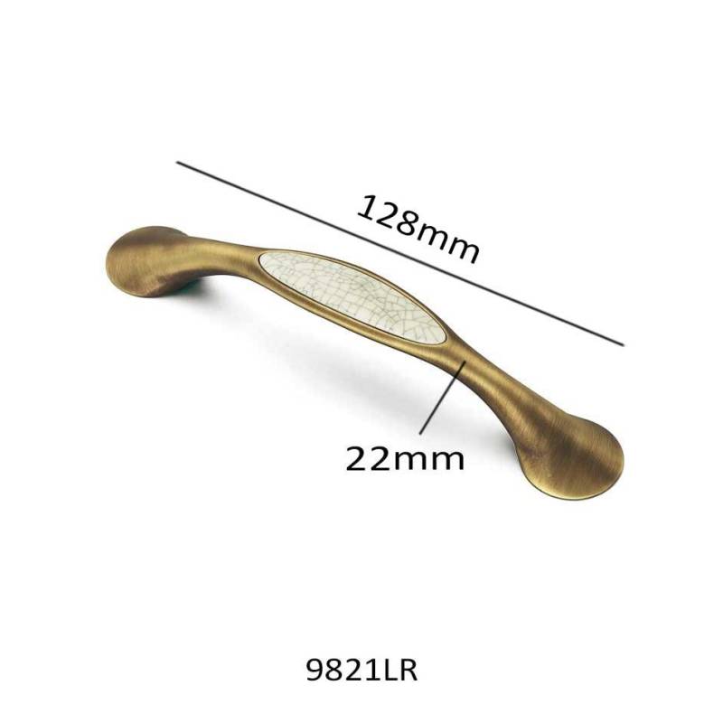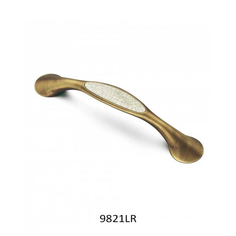 Pieza en acabado latonado cepillado rústico y porcelana con un acabado 'craquelé'. Un gran tirador 128mm de largo para todo tipo de muebles rústicos, coloniales o clásicos