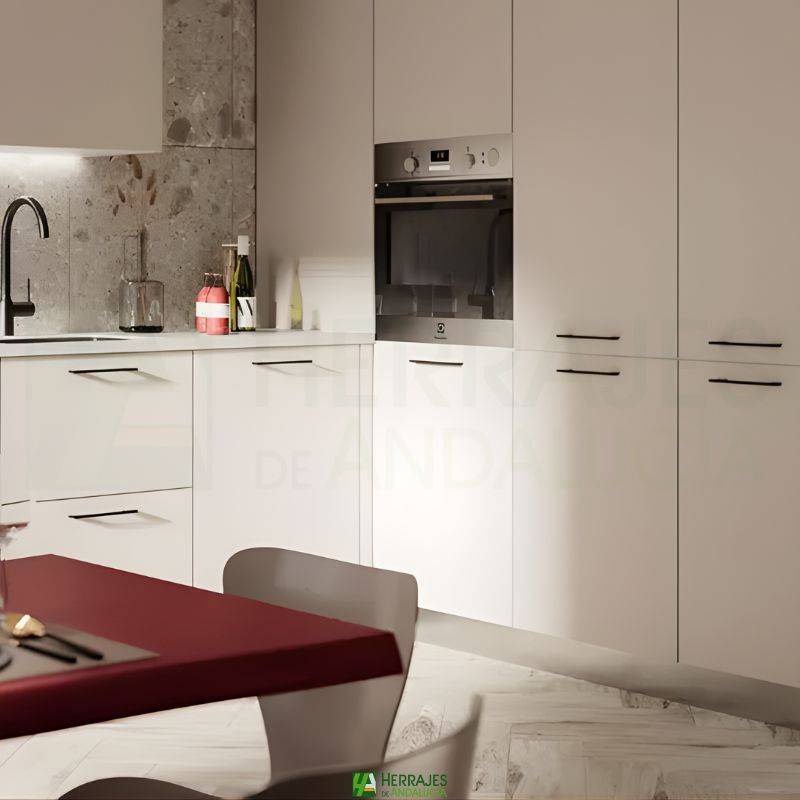 El tirador Matiz de 220mm de longitud y entre eje 192mm. Combina diseño contemporáneo y funcionalidad. Su acabado negro mate aporta elegancia y resistencia al uso diario. La ergonomía del tirador permite un agarre cómodo y seguro, facilitando su uso en todo tipo de muebles.