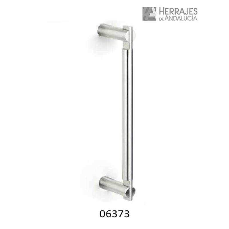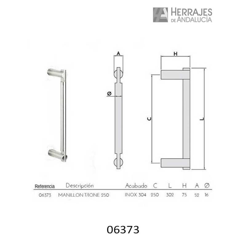 Manillón Ione para puertas de entrada, fabricado en acero inoxidable AISI-304, de diseño moderno y elegante con líneas rectas. Se instala directamente sobre puertas de madera o vidrio gracias a los accesorios incluidos. Modelo sin rosetas, con sección redonda de 16mm, 250mm entre tornillos, longitud total de 302 mm y fondo de 75mm.