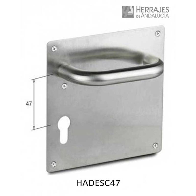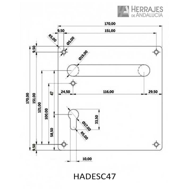 El juego de manillas Hades Yale presenta una placa cuadrada de 170x170mm con bocallave a 47 mm del tirador, y tornillería vista lo que hace que su instalación sea muy práctica y sencilla.