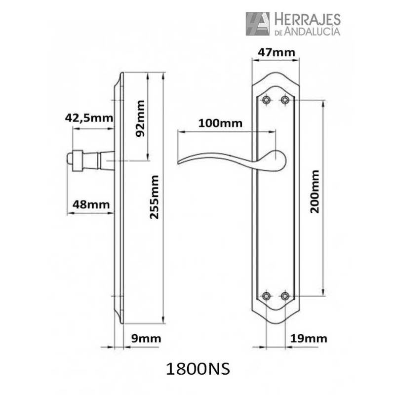 Manivela modelo 1800 de 255x47mm con placa y acabado en níquel satinado para puertas de entrada o paso.