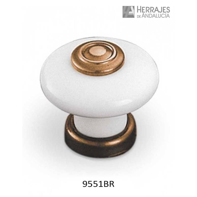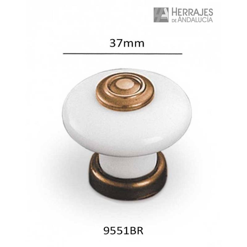- Se trata de una perfecta combinación de un pomo de porcelana blanca de diseño básico con un botón y una base metálicos en un bonito acabado de bronce que lo hacen fácilmente adaptable tanto a muebles rústicos como clásicos.