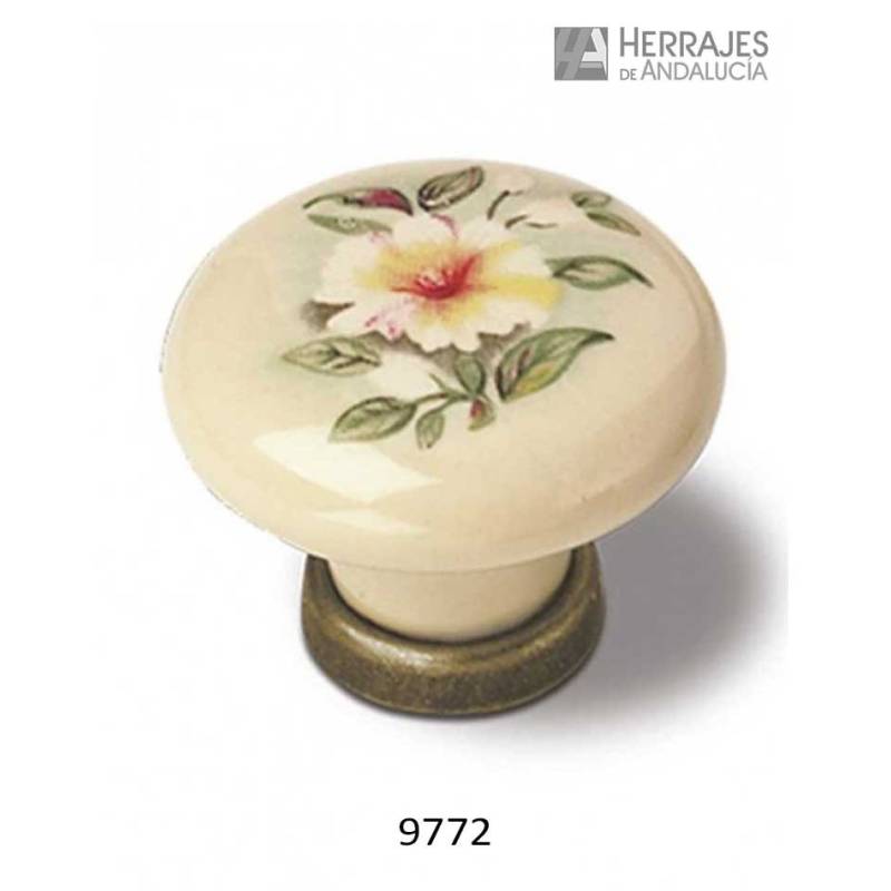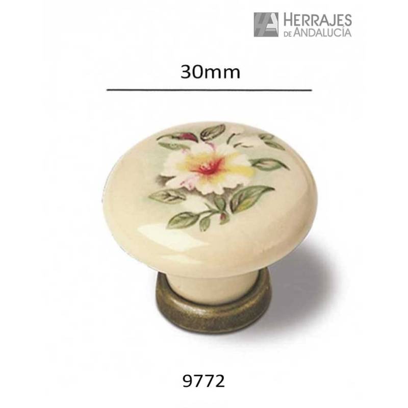 Elegante pomo de 30mm de diámetro que combina una pieza de porcelana de gran calidad con una decoración floral con terminales metálicos en acabado bronce.