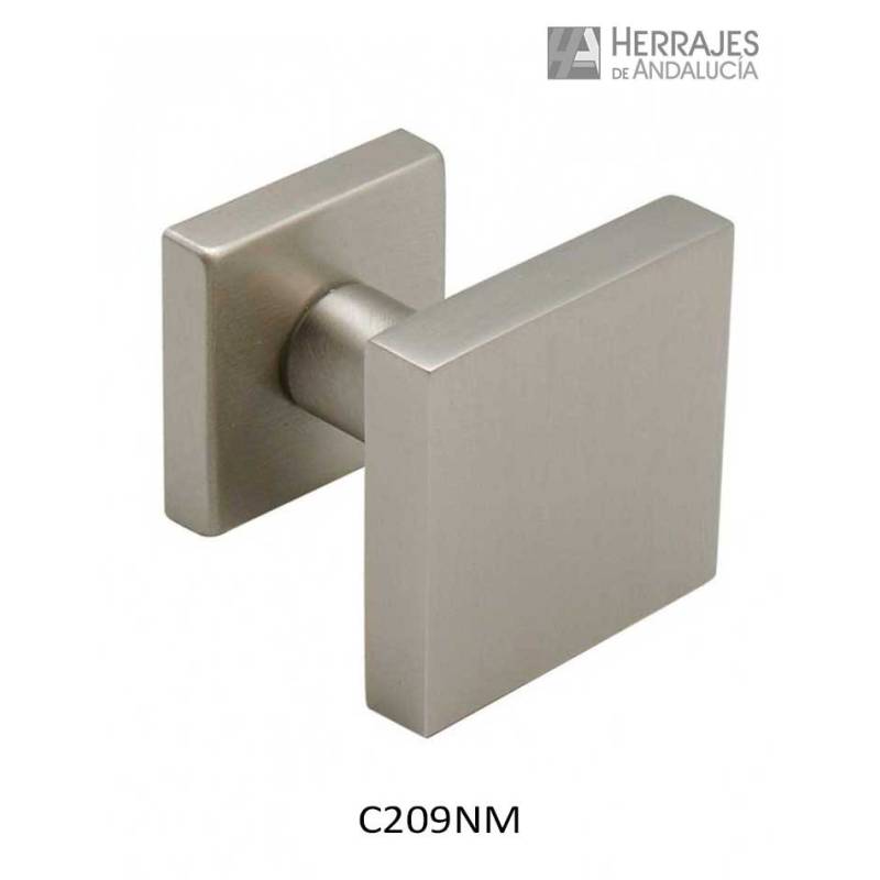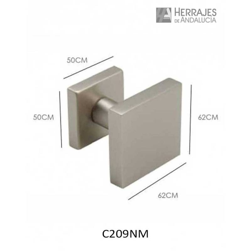Pomo para puertas modelo C209 de forma cuadrada en acabado niquelado mate y dimensiones de 62x62mm en su zona de agarre.