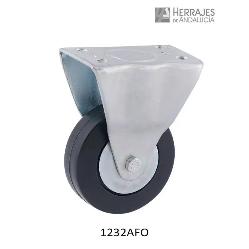 Rueda de goma en color negro montada sobre un soporte fijo tipo Fort. Este rodamiento se compone de una platina horizontal fija, por lo que no permite el giro del soporte.
