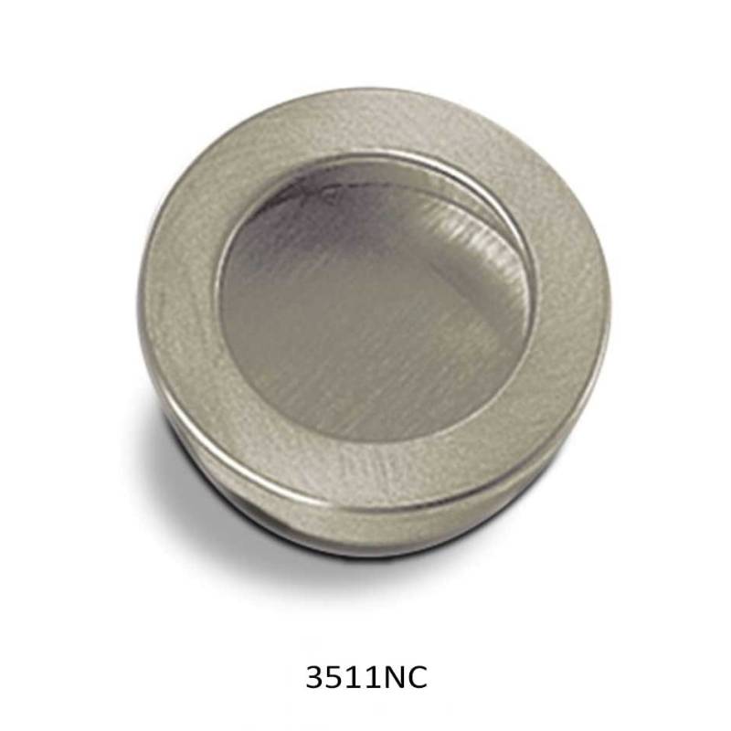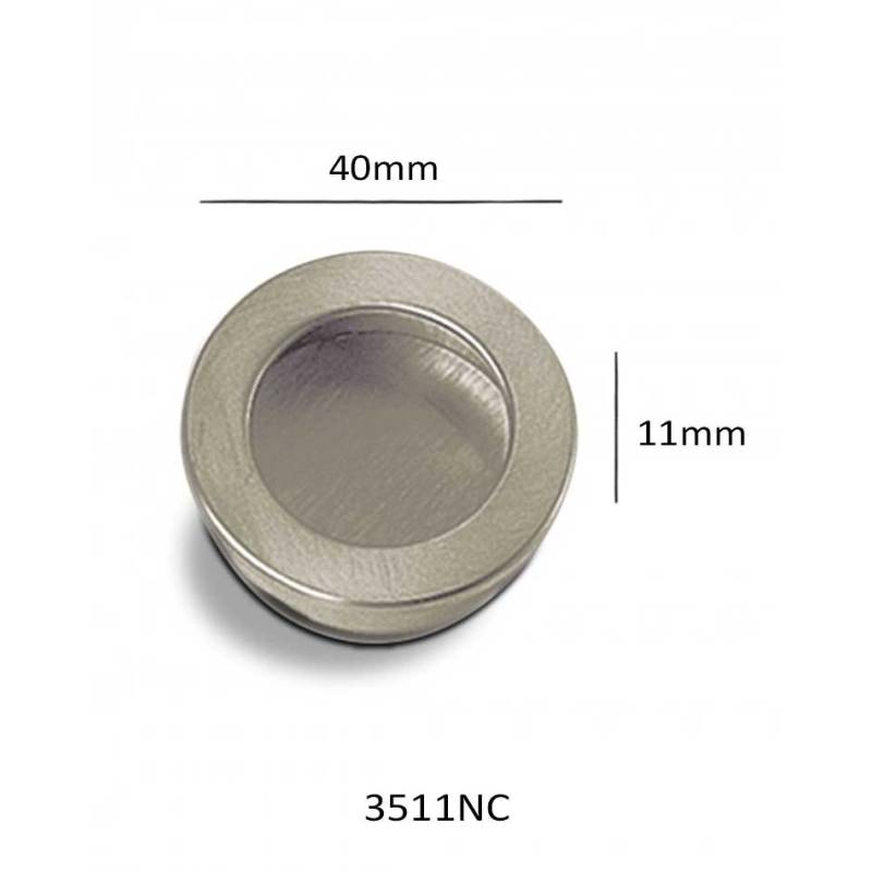 Placa redonda de 40mm de diámetro y acabado niquelado cepillado con fondo circular de muy fácil instalación. Resulta ideal para puertas correderas o como placa-tirador.