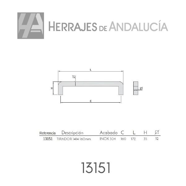 Tirador modelo 1414.Fabricado en acero inoxidable AISI-304. Distancia entre cogidas 160mm. Longitud total 172mm. Tirador de diseño recto con esquinas redondeadas y sección cuadrada de 12mm de lado.