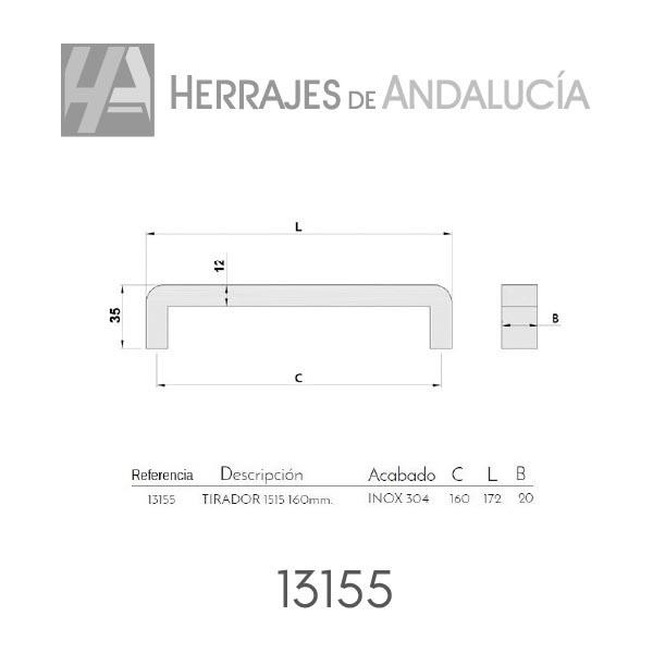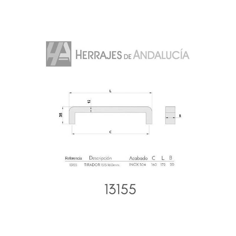 Tirador modelo 1515.Fabricado en acero inoxidable AISI-304. Distancia entre cogidas 160mm. Longitud total 172mm. Tirador de diseño recto con esquinas redondeadas y sección rectangular de 20X12mm.